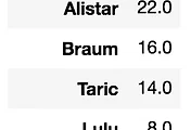 승률은 잔나가 63%로 가장높고, 쓰레쉬와 브라움, 탐켄치, 타릭, 오른이 50%가 넘는다. 알리스타의 경우 등장은 많이 하지만, 승률이 40% 미만인것 으로 보아....아무나 하면 안되는 픽인것 같다 ^^